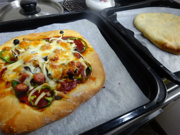 五輪を徹夜で見て おいしーい 2026.02.17 今日はお休み。夜中から寝ぼけながら五輪見てました。途中から目が覚めて思わずピザを作ってしまいました。 ホームベーカリーに材料を放り込んで40分。二次発酵しないで焼けるからすぐできる。眠いからこれ食べたら寝ます。